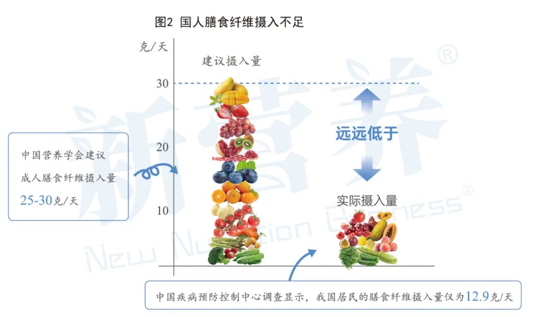 作为第七大营养素,膳食纤维已被越来越多的人所熟知,富含膳食纤维几乎成了健康食品的代名词。即便是这样,仍然只有少数人每天吃够推荐量的膳食纤维。根据中国疾病预防控制中心(2013-2022)关于中国居民营养健康状况监测结果表明,国人平均膳食纤维摄入量约为12.9g/天,还不及推荐摄入量的一半,所以强化食品加工中膳食纤维的含量成为必要。(见图2)