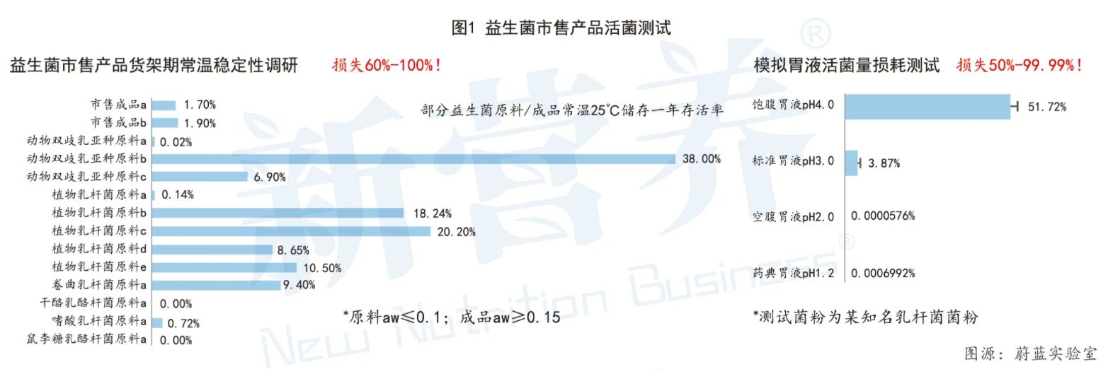 众所周知,当益生菌“活着”到达肠道才有可能定植并发挥“益生”作用。然而,在对比了十余株常见益生菌原料及成品的货架期稳定性后发现,在常温25℃的条件下储存一年后,参与调研的菌株存活率最高仅为38%,超过三分之一的菌株存活率甚至不到1%。不仅货架期内菌株稳定性低,经体外胃液模拟活菌损耗测试显示,在模拟饱腹状态下的胃液中(pH 4.0),实验菌粉的存活率达51.72%;但在pH低的模拟空腹胃液状态下,及严苛的模拟药典胃液中,几乎检测不到活菌。由此可见,在现有技术条件下,无论是货架期持续的稳定活性还是服用后肠道内的活菌数均难以有效保障,因此要真正实现“肠内活菌”就必须从技术入手实现突破,而这正是蔚蓝家美的“看家本领”。(见图1)