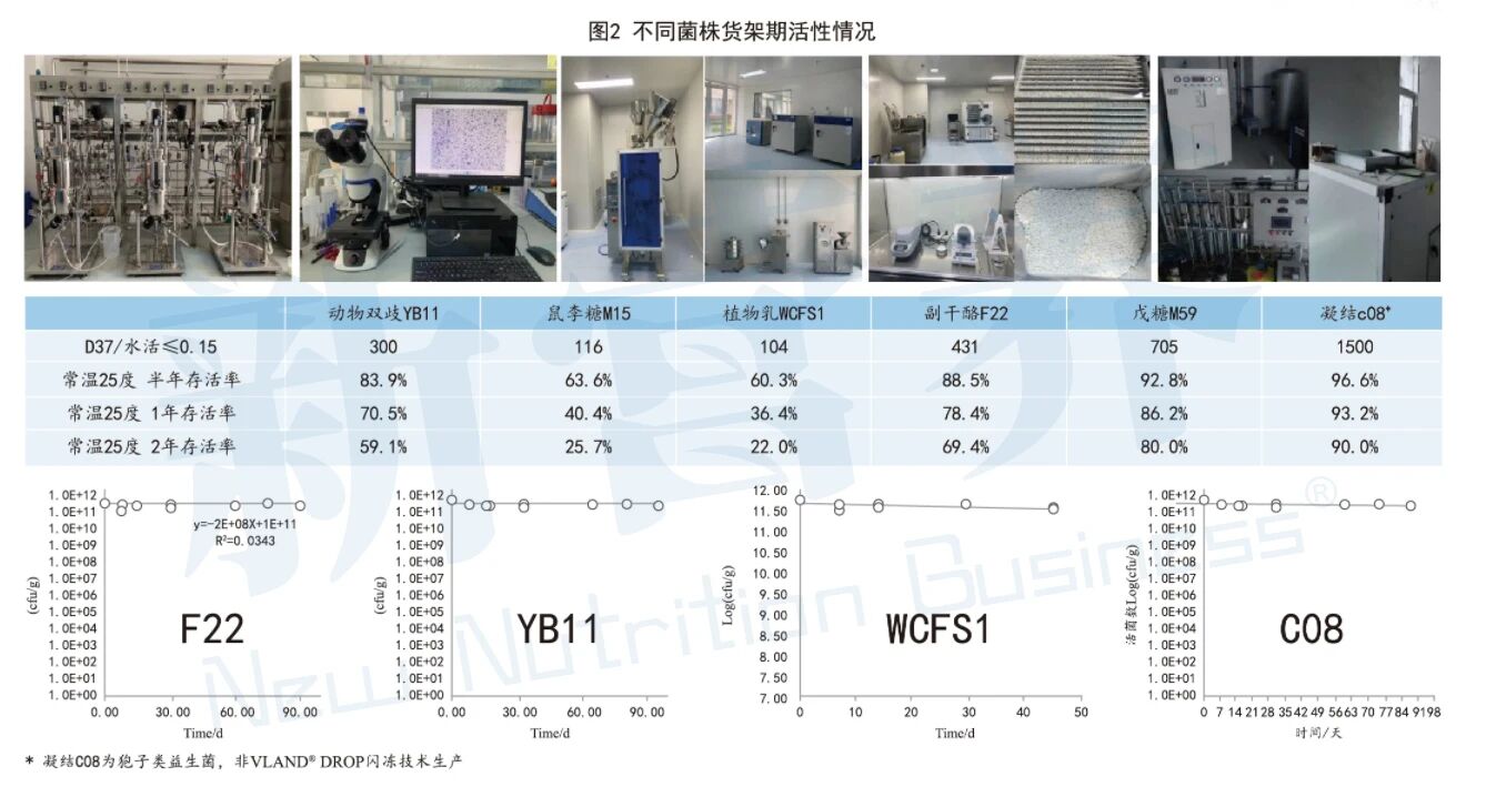要提高菌粉货架期的稳定性,“冻干”是益生菌菌粉生产过程中的关键步骤,直接影响益生菌在货架期菌活的稳定性。在冻干过程中,菌体活性时刻面临着来自温度应力、渗透应力、饥饿应力、机械应力等方面的多重挑战。为了更好的应对上述挑战,蔚蓝家美依托涵盖离心工艺、混合处理、急冻制粒、冻干工艺等在内的多项技术突破建立了菌活稳定性解决平台——VLAND®Drop闪冻技术。在这一关键技术的加持下,绝大多数菌株半年内的存活率可达60%以上,其中的优良菌株在常温下两年存活率仍能保持在50%以上,菌株货架期内活性大幅提升。(见图2)