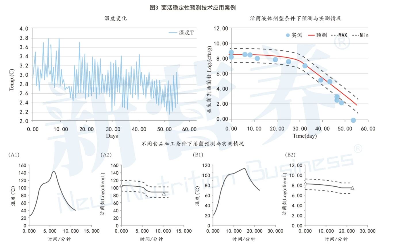 同时,为了便于生产端和品牌端更好的掌控菌株活性情况,蔚蓝家美创新了VLAND®Pred菌活预测技术。基于预测微生物学,采用数学的方法描述动态环境条件下,活菌数变化和外部环境因素之间的响应关系,并对微生物的生长以及灭活动力学做出预测。借助VLAND®Pred菌活预测技术建立的预测模型可以根据货架期温度变化,或者食品热加工的动态温度变化,即时、精准地获得活菌数变化情况,从而将生产加工和货架储藏两个重要环节打通,形成“预测-调整-监测”的完整闭环,为提高货架期内活菌数提供有力保障。(见图3)