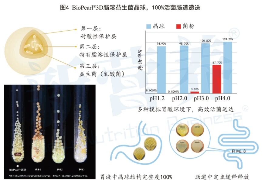 当消费者拿到产品后,对于菌活的另外一场考验开始了。当菌粉进入人体后,首先遇到的考验就是胃液。正常的胃液是无色透明的酸性液体,空腹胃酸pH为0.9~1.5,但消化时间短,过胃时间不超过30分钟,进食后可暂时升高到2.0-4.0,但过胃(消化)时间延长,约2-3h,益生菌更易受到多种消化酶(蛋白酶、胆汁等)伤害;不论饭前(空腹)还是饭后,益生菌要活着抵达肠道,都面临多种威胁。这时就轮到BioPearl®3D肠溶益生菌晶球技术上场了:利用该技术打造的益生菌晶球粒径为2.2-2.8mm,外层是耐酸性保护层,中间是特有脂溶性保护层,里面才是包裹的益生菌。这种特有的三层结构经胃液测试后结构完整度可达100%,在依次经过模拟胃液、胆盐、胰酶以及人工结肠液处理后,活菌存活率可达90%以上(ZL202411179225.8一种肠道道定点缓释的三层包埋结构益生菌晶球及其制备方法),有效提高了益生菌在体内的活菌数量。(见图4)