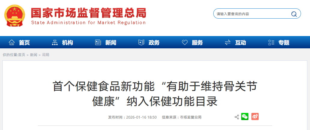 2026年1月16日,国家市场监督管理总局正式发布《允许保健食品声称的保健功能目录有助于维持骨关节健康(缓解疼痛或僵硬/缓解软骨损伤)》。这一政策动向标志着国家对骨骼关节健康问题的重视达到新的高度,为相关功能食品的研发和市场推广提供了明确的政策依据和规范指引。