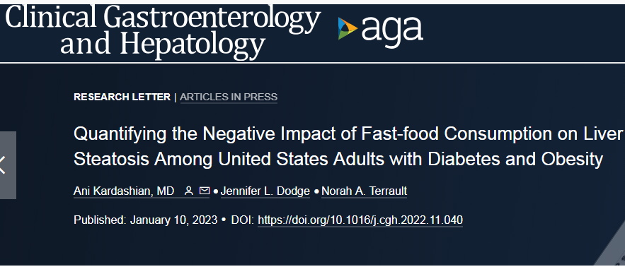 近日,一篇发表在国际杂志Clinical Gastroenterology and Hepatology上题为“Quantifying the Negative Impact of Fast-Food Consumption on Liver Steatosis Among U.S. Adults with Diabetes and Obesity”的研究报告中,来自南加利福尼亚大学等机构的科学家们通过研究发现,摄入快餐或与人类肝脏疾病发生有关。研究者表示,摄入快餐或与机体非酒精性脂肪肝发生有关。