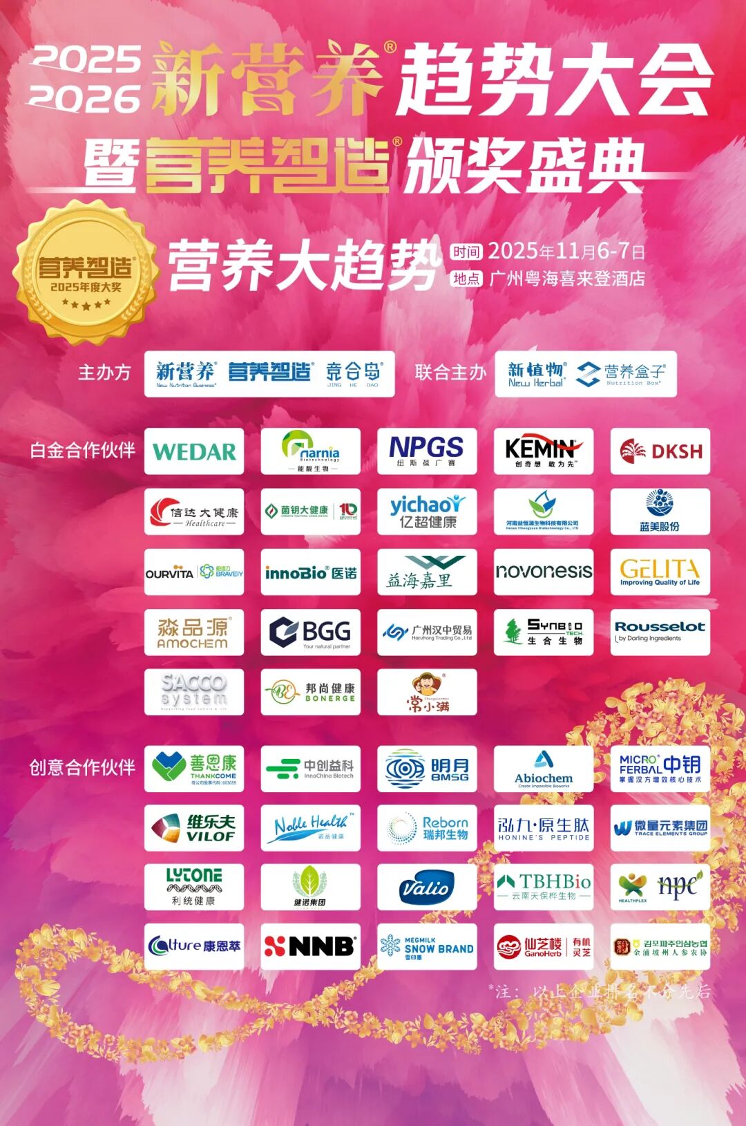 11月6-7日,2025-2026新营养趋势大会暨营养智造颁奖盛典将在广州隆重举行。聚焦营养产业增长密码,共探行业未来趋势。与业界精英共襄盛举,解码营养智造,助力企业持久发展,领跑新营养时代!下一站,广州等你!