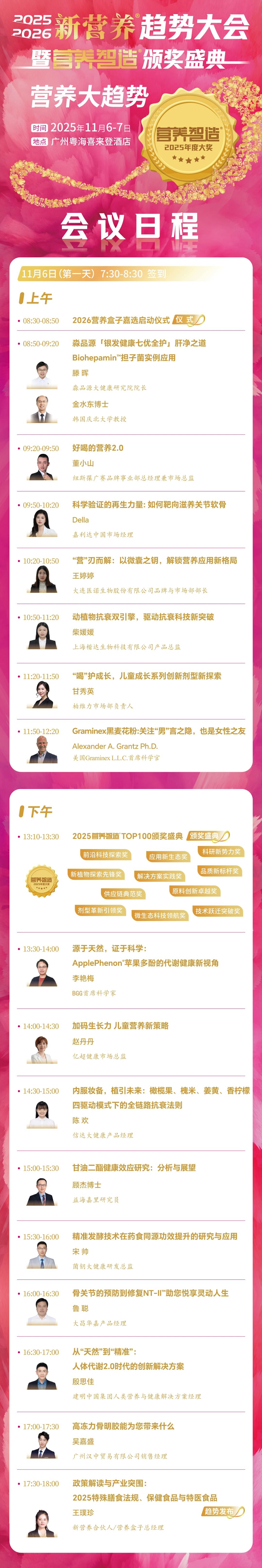 11月6-7日,2025-2026新营养趋势大会暨营养智造颁奖盛典将在广州隆重举行。聚焦营养产业增长密码,共探行业未来趋势。与业界精英共襄盛举,解码营养智造,助力企业持久发展,领跑新营养时代!下一站,广州等你!