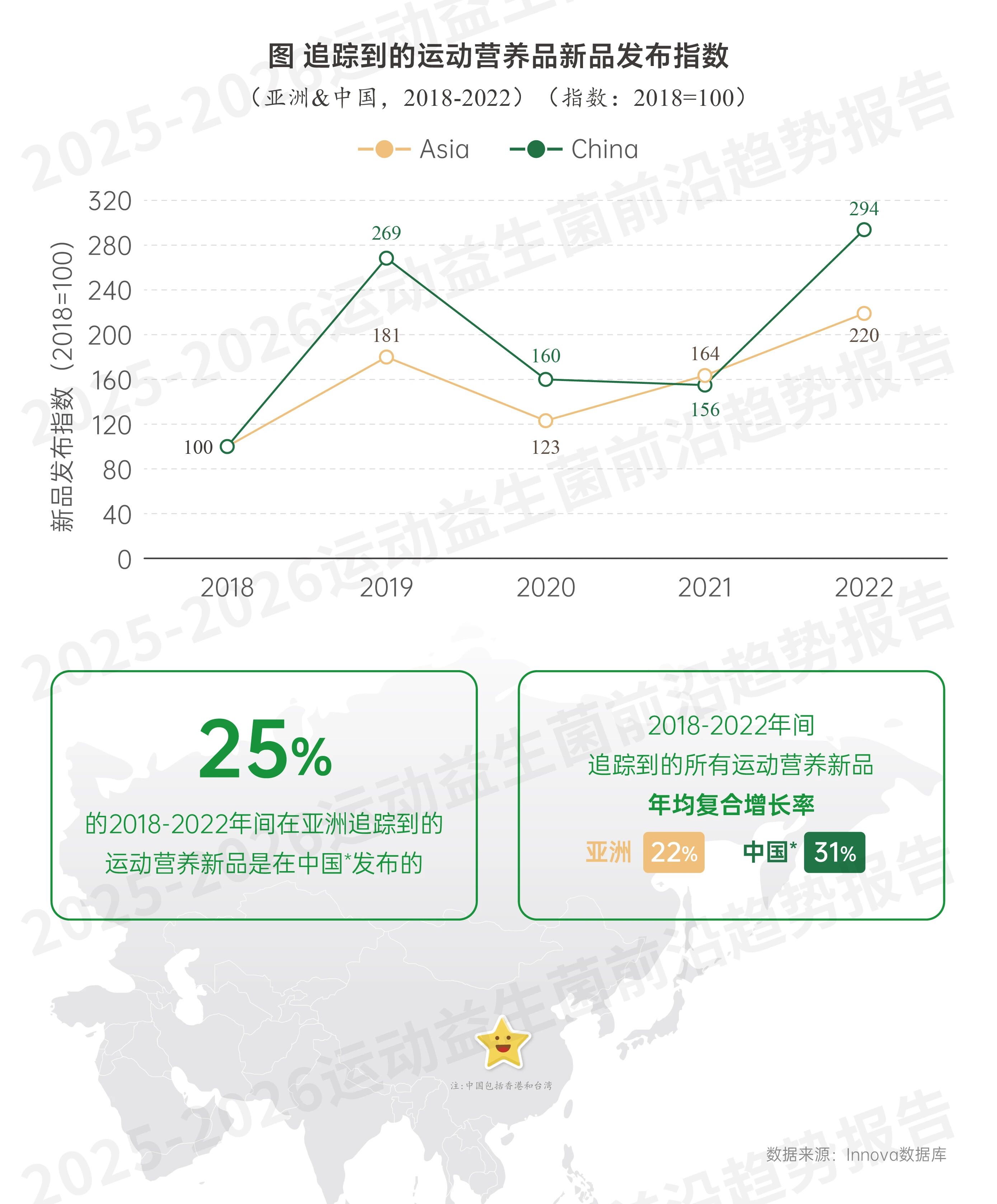 INNOVA的数据进一步印证了中国在亚洲运动营养品市场的关键地位。2018-2022年间发布的运动营养品数量占亚洲总量的四分之一。特别是大流行期间,中国运动营养市场呈现出高速发展的态势,年复合增长率超过 31%,相比之下,亚洲地区整体年复合增长率为22%,有望成为全球增速最快的市场之一。