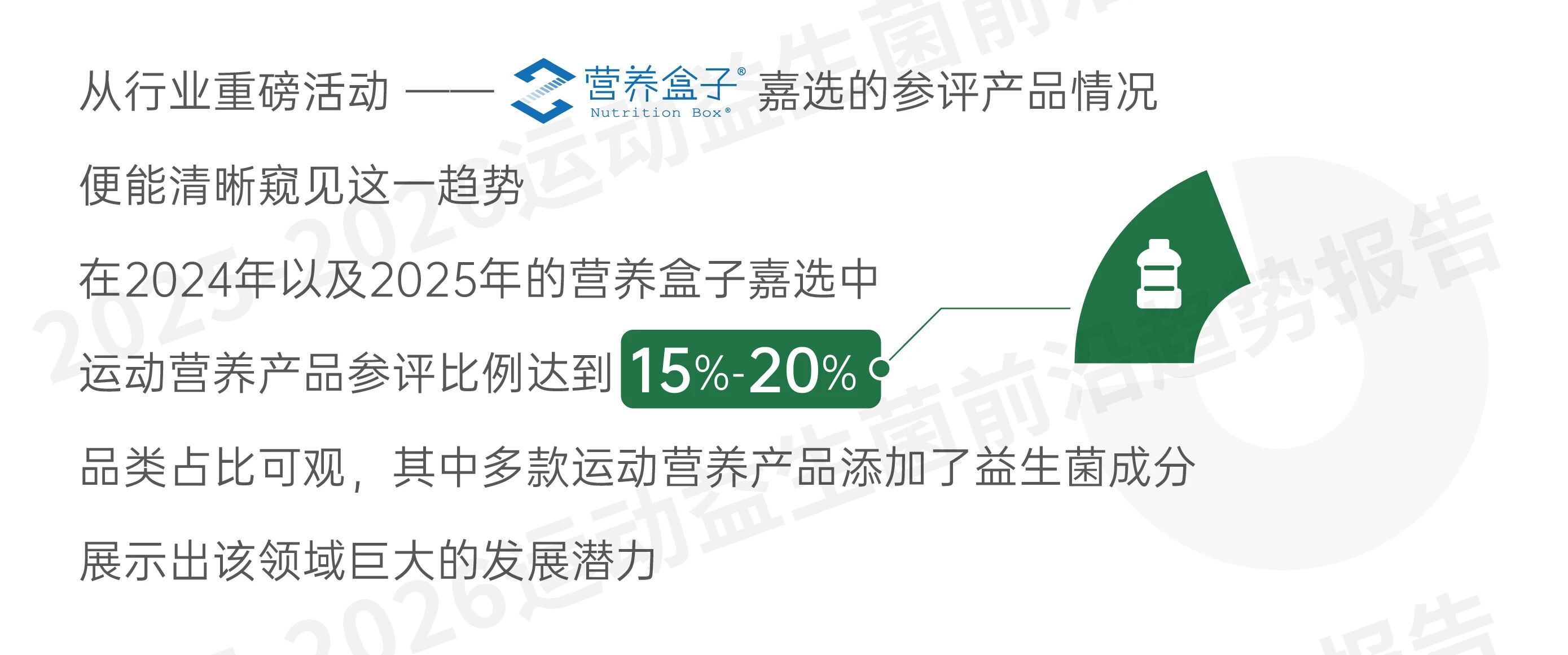 Lumina Intelligence对20个国家运动营养产品的分析表明,益生菌在运动场景中的应用潜力尚未得到充分挖掘,但其加速脂肪代谢、缓解运动炎症、缩短恢复周期等功效,与消费者日益增长的需求高度契合。在国内市场,2024 - 2025年营养盒子嘉选参评产品数据显示,15% - 20%的运动营养品已添加益生菌,其中植物基蛋白粉占比高达38%,这一数据预示着“益生菌+蛋白”将成为下一波创新潮流。