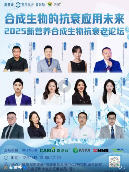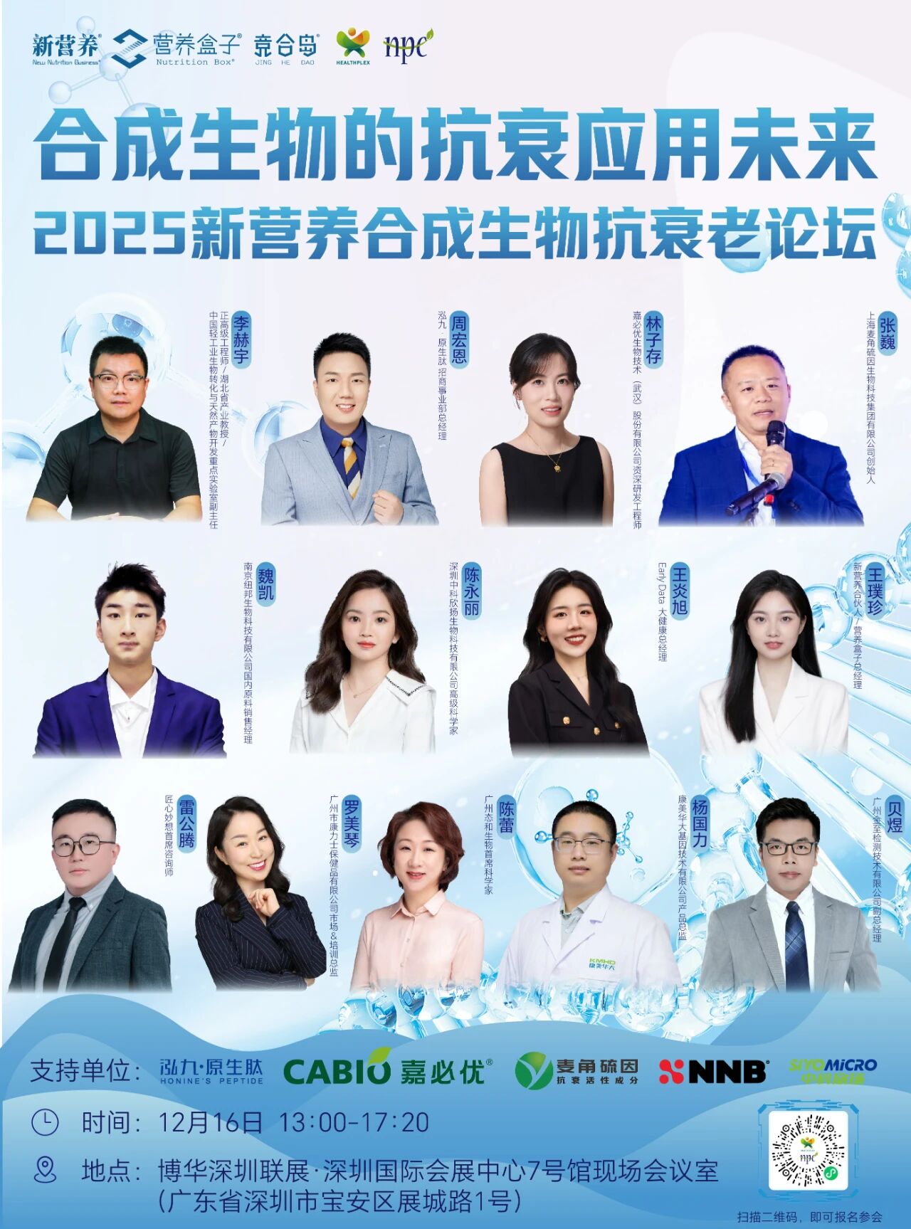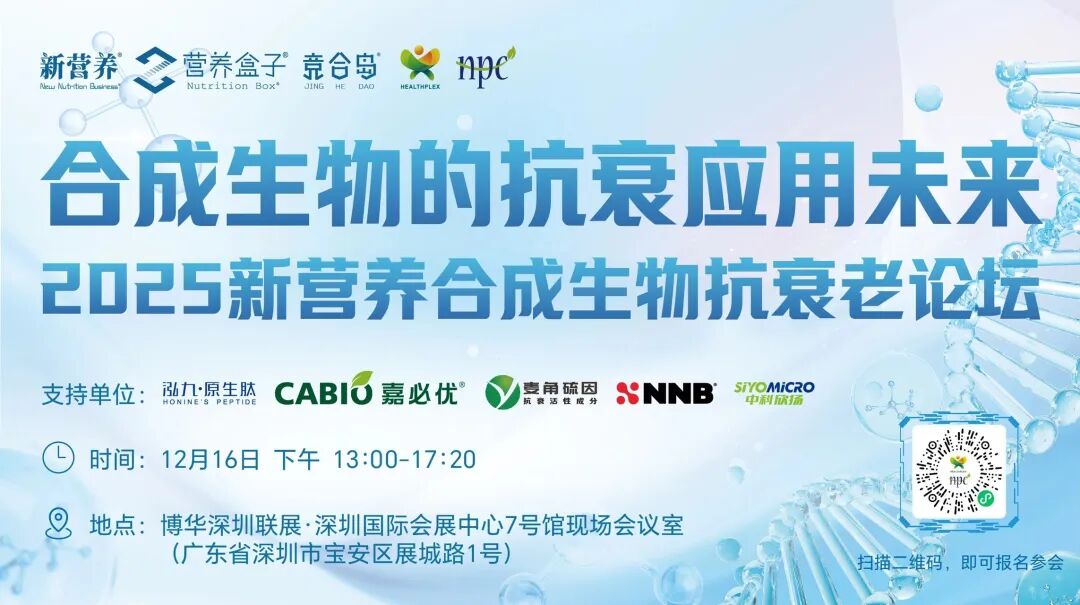 在此背景下,新营养将于12月16日“2025博华深圳联展”期间,在深圳举办「2025新营养合成生物抗衰老论坛」。论坛以“合成生物的抗衰应用未来”为主题,汇聚行业顶尖专家、企业领袖及科研机构。在论坛上,各方将共同探讨抗衰产品开发的创新路径,分享最新的科研成果和实践经验。这不仅为行业提供了一个交流与合作的平台,更为抗衰行业的未来发展提供了前瞻性洞察与可落地解决方案。