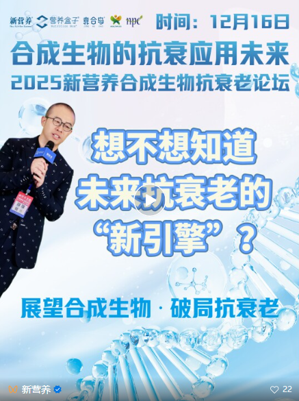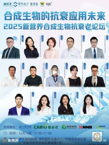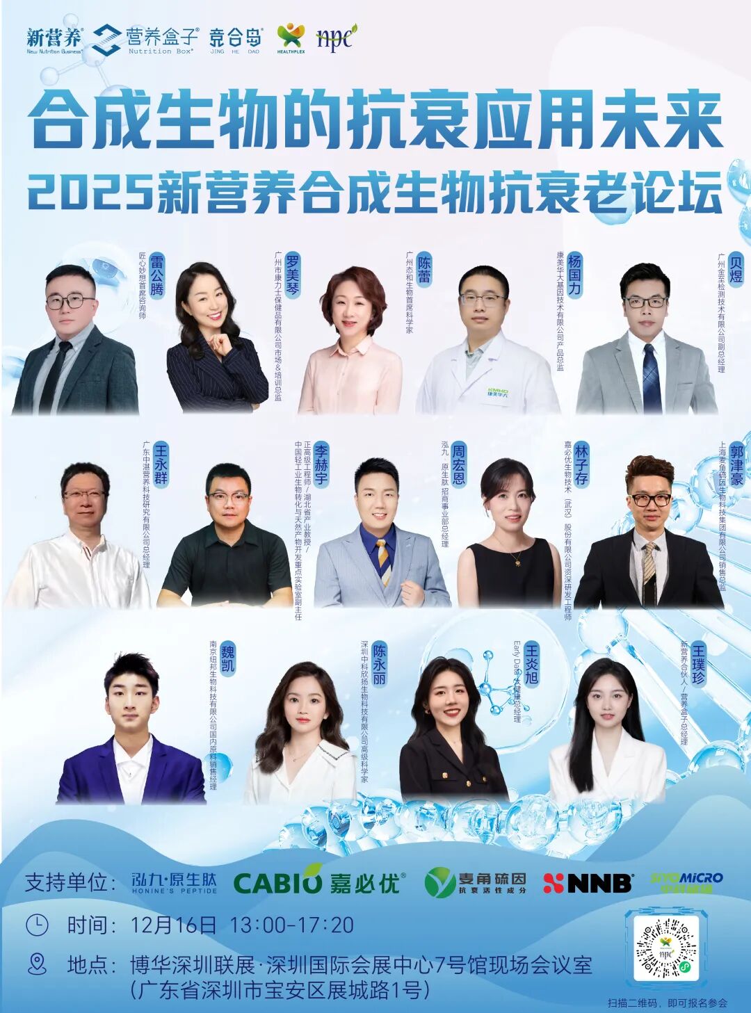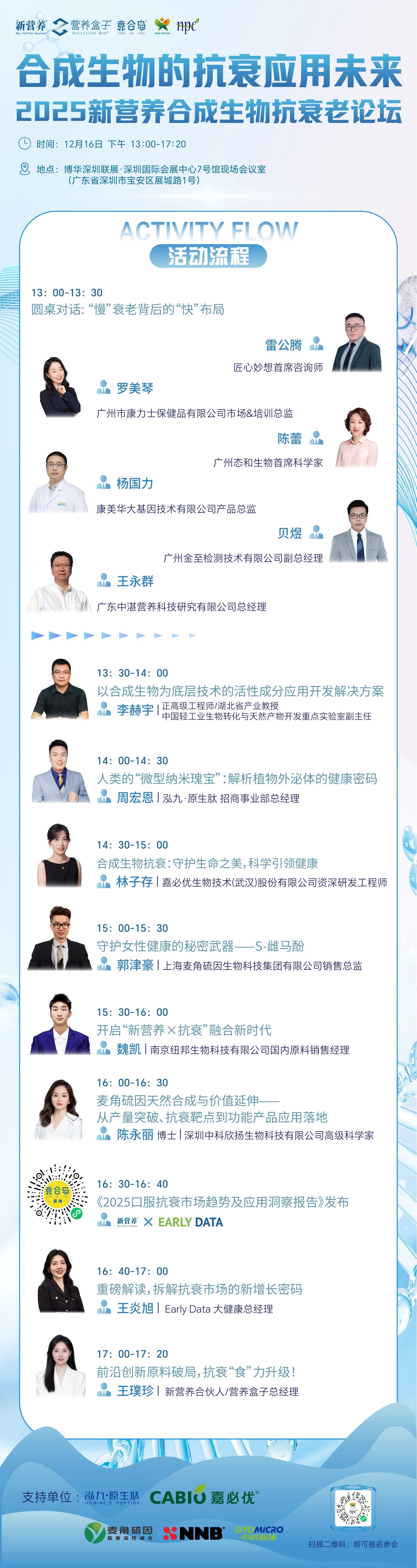 在此背景下,新营养将于12月16日“2025博华深圳联展”期间,在深圳举办「2025新营养合成生物抗衰老论坛」。论坛以“合成生物的抗衰应用未来”为主题,汇聚行业专家、企业领袖及科研机构。在论坛上,各方将共同探讨抗衰产品开发的创新路径,分享最新的科研成果和实践经验。这不仅为行业提供了一个交流与合作的平台,更为抗衰行业的未来发展提供了前瞻性洞察与可落地解决方案。