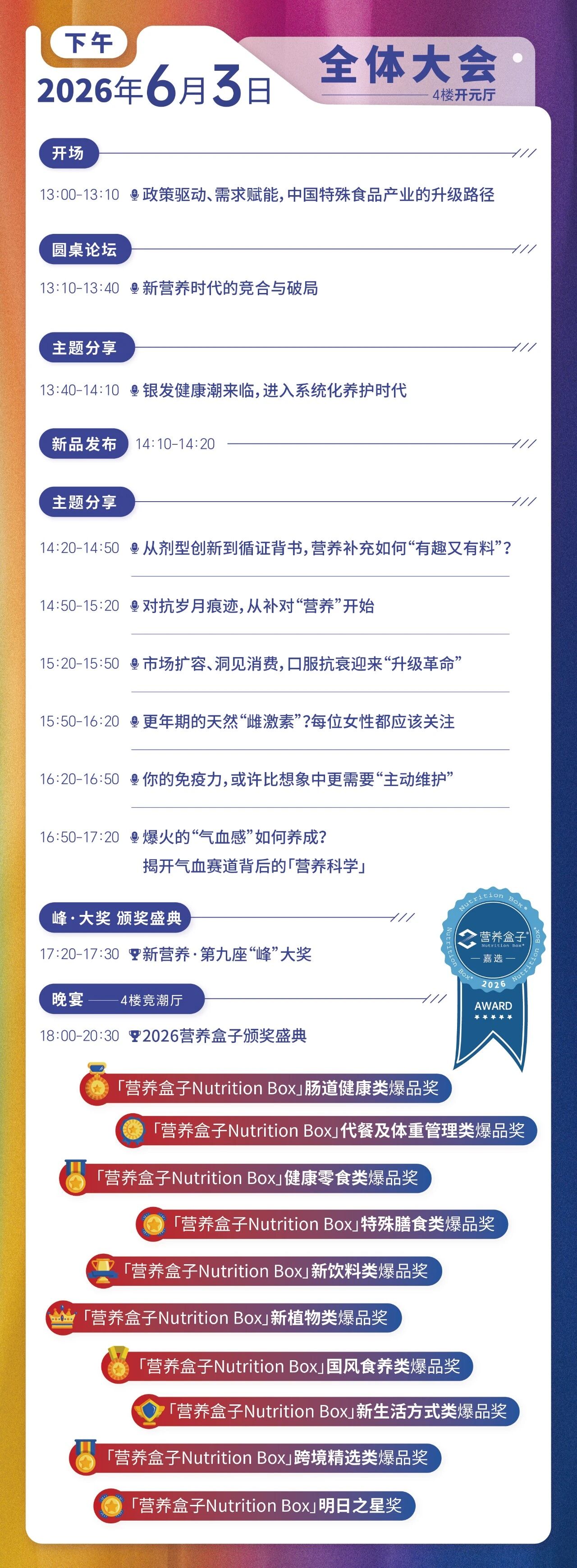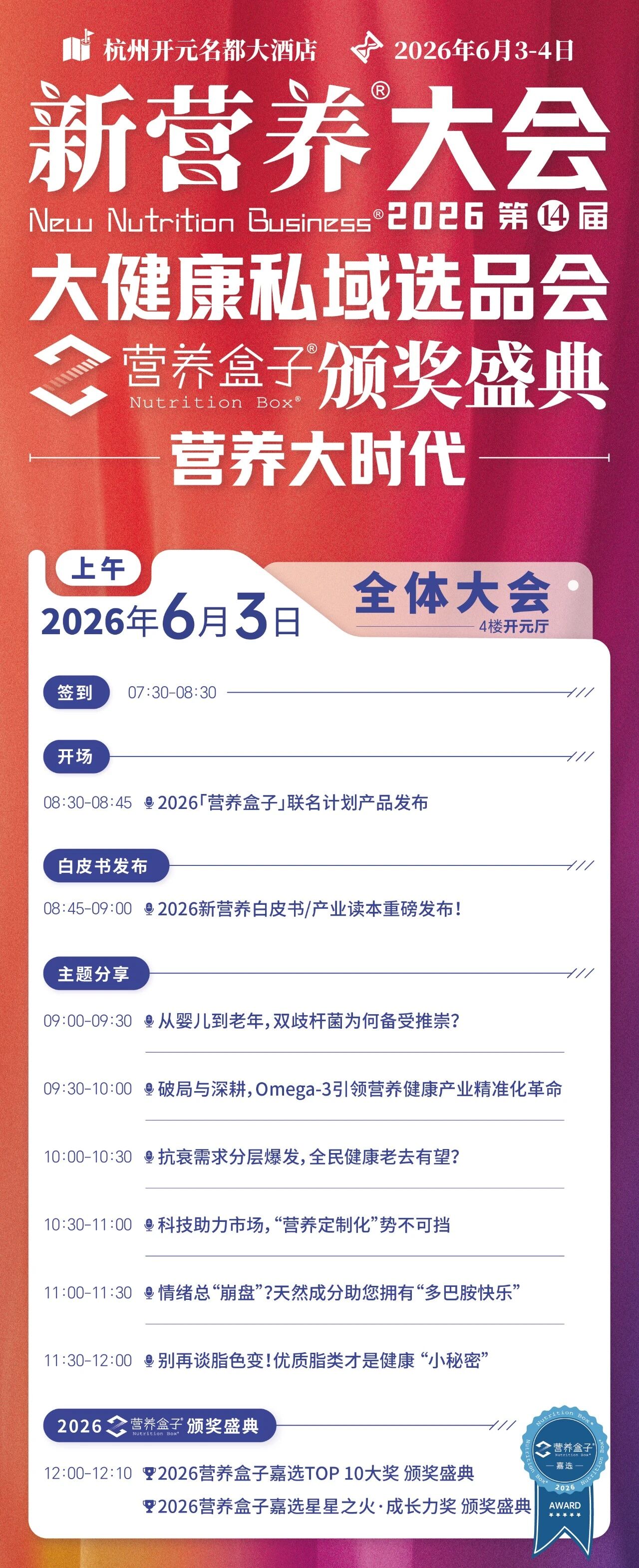 6月3-4日,2026年第14届新营养大会暨营养盒子颁奖盛典将在杭州开元名都大酒店隆重举行。本次大会以“营养大时代”为主题,通过1场全体大会+6场营养生态会议+近百场专题研讨+行业报告/白皮书发布+“营养盒子大奖”揭晓,围绕打造趋势、未来营养大数据、行业爆款发掘、供应链创新、B端与C端融合等多个方面展开探讨,构建全球营养健康产业深度融合的交流、对接、服务平台。