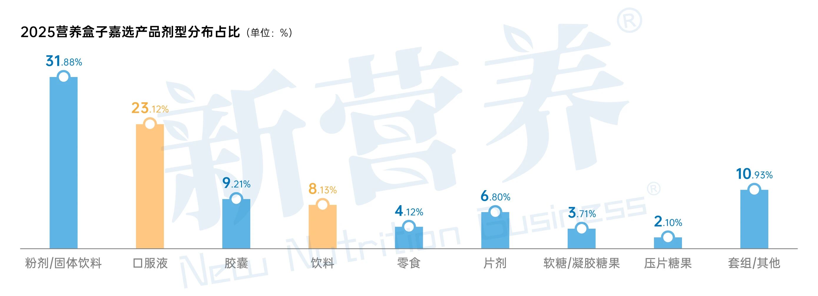 剂型分布上,粉剂/固体饮料以31.88%的占比依旧领跑,但液体剂型的崛起成为显著亮点——若将口服液(23.12%)与饮料品类合并计算,其占比已与粉剂基本持平,有望在未来实现反超。这一变化背后,是消费者对便携性、服用体验和口感的更高要求,液体产品无需冲泡、即时饮用的优势正逐步获得市场青睐。