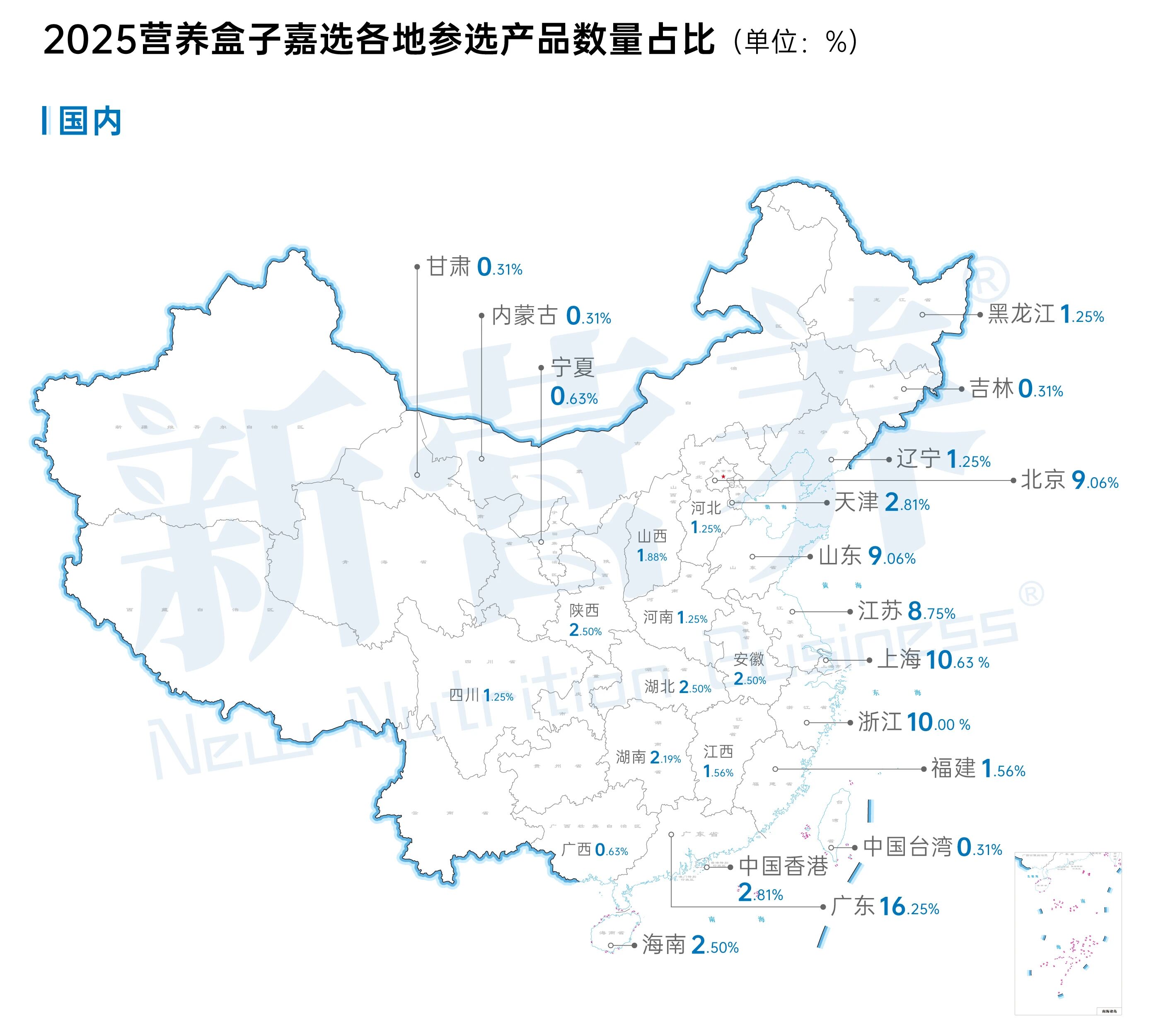 地域分布上,营养健康产业呈现明显的集群效应:广东(16.25%)与江浙沪地区合计占据半壁江山,北京、山东、江苏等传统大省紧随其后,形成“核心区域引领、多点分布”的格局。值得关注的是,跨境产品首次崭露头角,美国、英国、日本等国的产品纷纷参与,为行业注入多元活力。