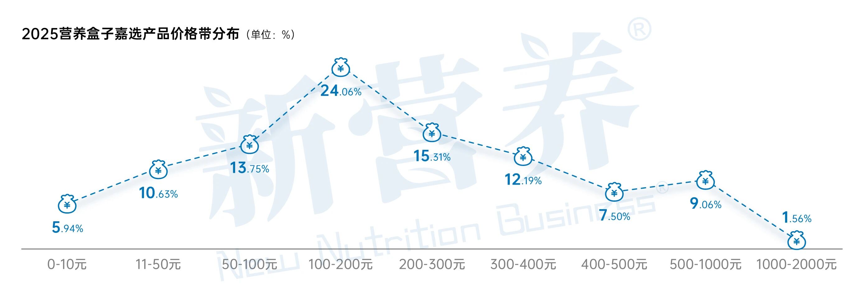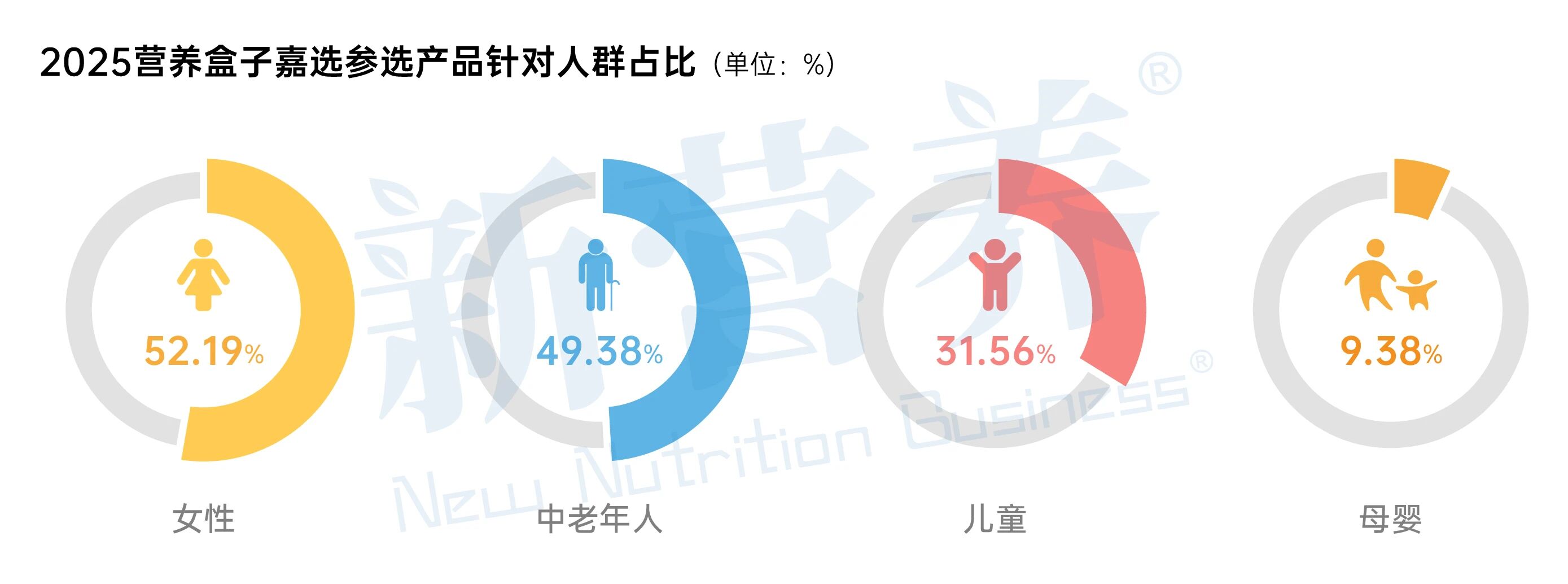 营养健康产品的功能指向始终围绕消费者核心诉求,2025年嘉选产品中,提高免疫力(29.69%)和肠胃健康(27.50%)仍占据主导地位,成为大众健康管理的“刚需”。与此同时,行业需求呈现多元化增长态势:体重管理(18.12%)、气血健康(16.25%)、基础营养(17.81%)实现大幅提升,运动营养(13.75%)、缓解体力疲劳(13.12%)及情绪与睡眠管理(11.87%)的占比也显著增长,而此前热门的口服美容品类则略有下降,反映出消费者健康需求从单一美容向全面身心养护的延伸。