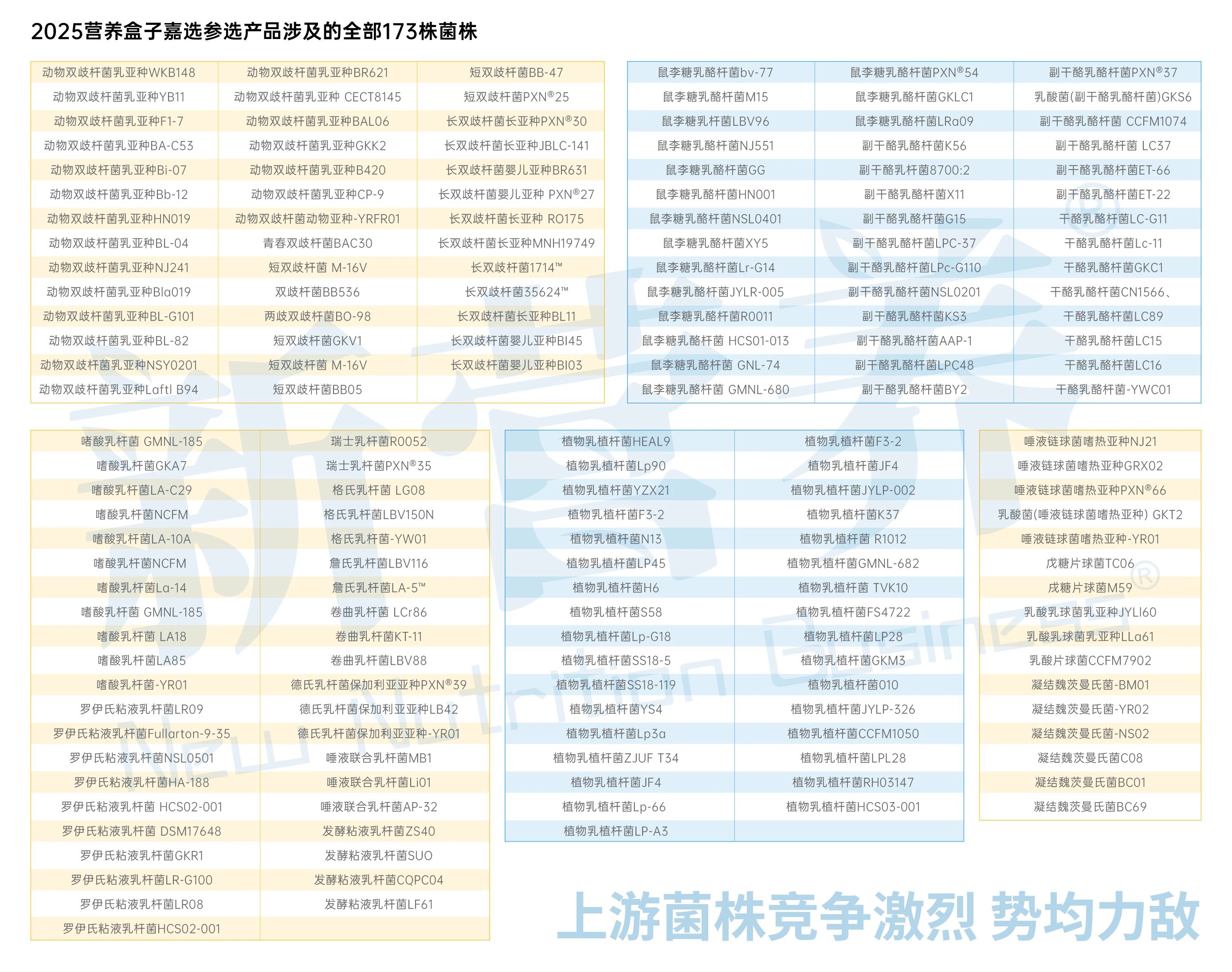 2025年,益生菌/益生元类产品强势回归,成为年度热门品类,行业进入“群雄争霸”的战国时代。数据显示,参评产品涉及173株益生菌菌株,最多的单株菌仅应用于7个产品,多数菌株分散在1-2个产品中,上游菌株竞争激烈且势均力敌,已无绝对的“明星菌株”。
