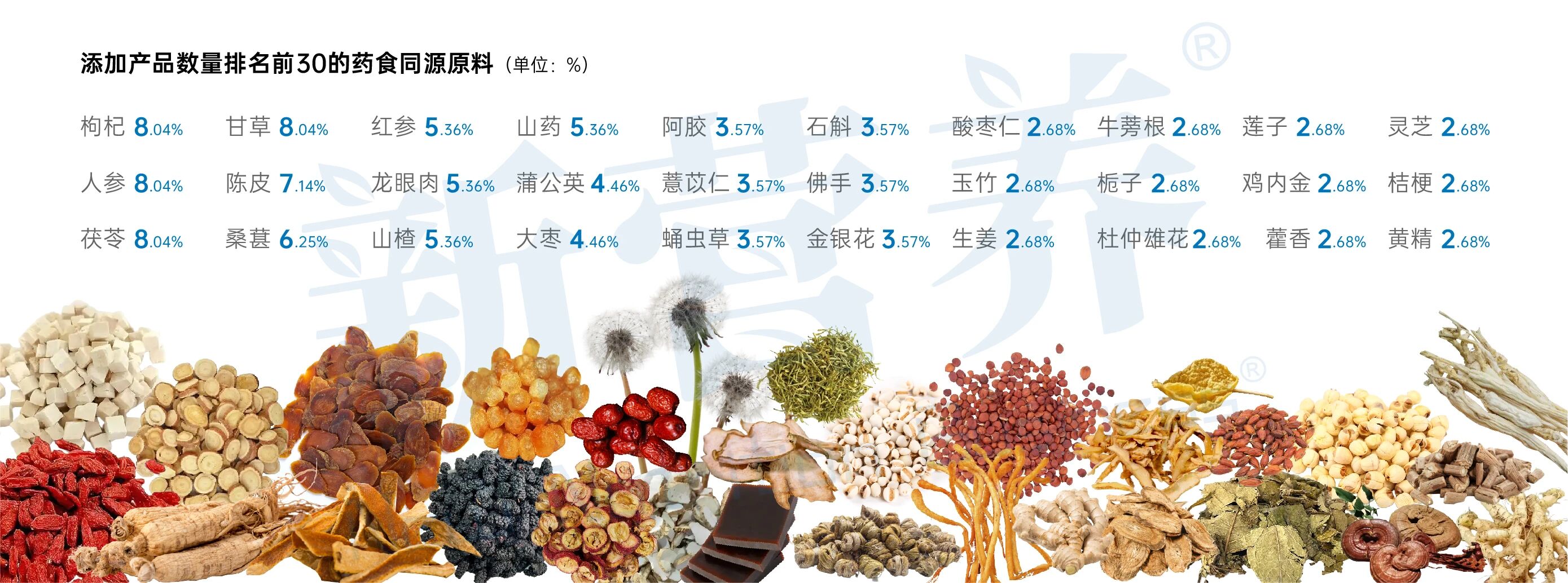 与往年人参、铁皮石斛等原料“一枝独秀”不同,2025年食药物质产品呈现“没有突出原料,只有核心需求聚焦”的特点。添加产品数量排名前30的原料中,枸杞、甘草、人参、茯苓等占比均在10%以下,分布均衡,且整体涉及近100种食药物质原料,覆盖范围广泛。