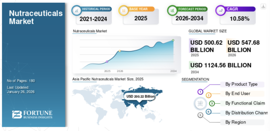 从产业趋势看,全球营养健康市场正处于快速增长期。根据FortuneBusinessInsights的数据,2025年全球营养保健品市场规模为5006.2亿美元,预计将从2026年的5476.8亿美元增长到2034年的11245.6亿美元,预测期内复合年增长率为10.58%。亚太地区在营养保健品市场占据主导地位,2025年市场份额为39.99%。