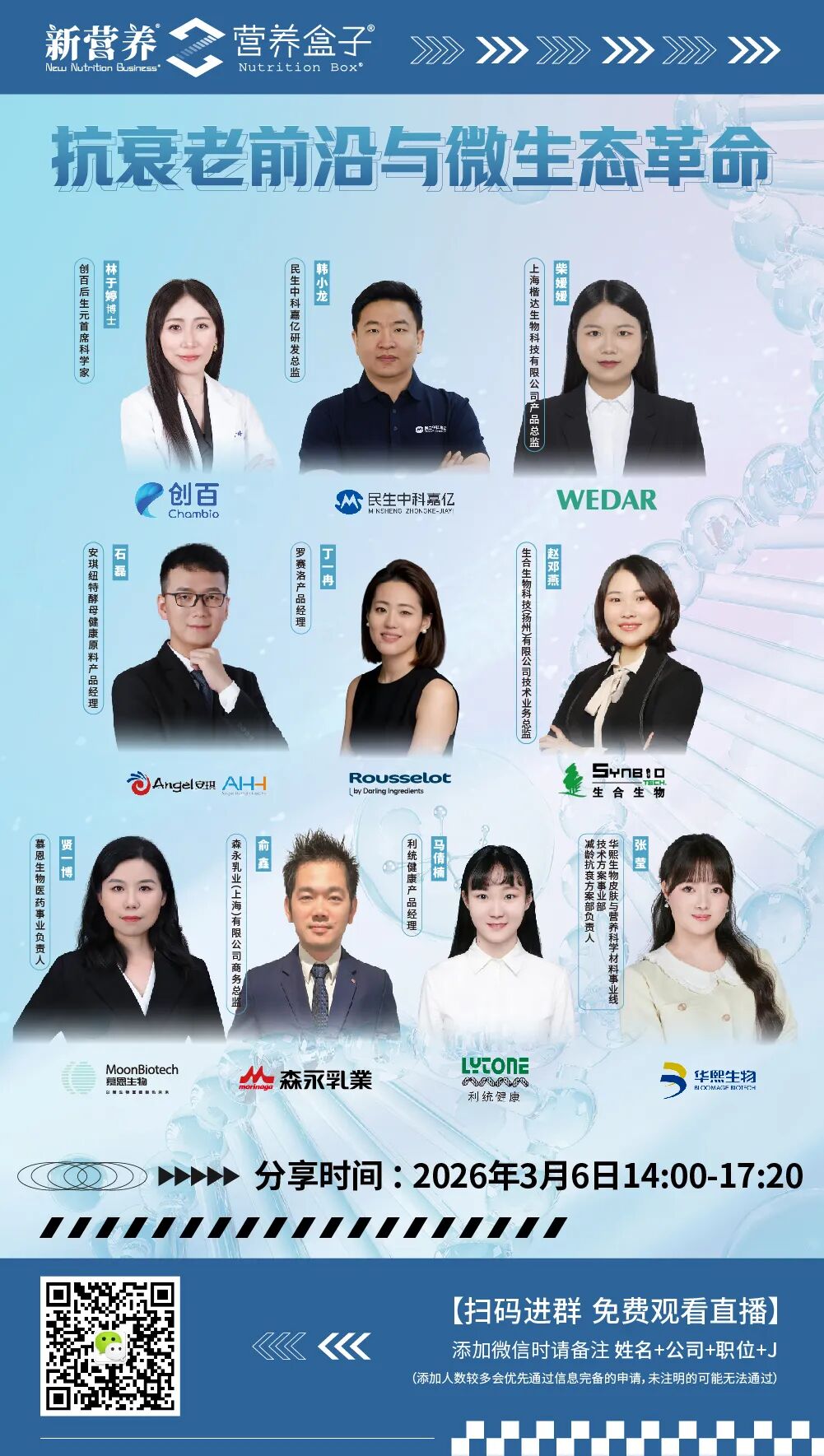 一边是全民关注的抗老需求,一边是潜力无限的微生态风口。为帮助大家为了精准把握抗老科学内核,把握微生态产业新机遇,新营养将于3月6日下午举办「抗衰老前沿与微生态革命」线上论坛,论坛将聚焦内服抗老、微生态健康食品的研发趋势与市场落地路径,助力行业从业者与普通消费者,精准掌握科学抗衰的关键要点,读懂微生态与健康的深层关联。