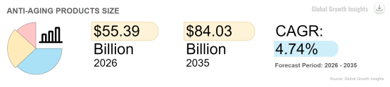 全球老龄化加剧及抗衰需求升级,口服抗衰市场成为健康消费领域的重要增长极。据Global Growth Insights数据显示,2025年全球抗衰老产品市场价值为528.8亿美元,2026年将进一步扩大至553.9亿美元,市场保持稳定增长态势;预计2027年市场规模将突破580.1亿美元,到2035年将攀升至840.3亿美元,在2026年至2035年期间,市场年均复合增长率将稳定在4.74%,展现出强劲的长期发展韧性。