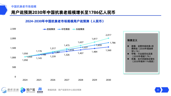 在全球市场稳步增长的大背景下,中国市场的增长尤为显著。2024年,国务院印发了《关于发展银发经济增进老年人复制的意见》,首次明确提出了发展抗衰老产业的目标和26项措施,为口服抗衰行业的规范化、高质量发展营造了良好的政策环境。此外,用户说曾在《2025年线上抗衰老消费趋势洞察》中,综合Research and Markets、Statista及Precedence Research等多家国际咨询机构的预测数据指出,预测至2030年,中国抗衰老市场规模有望冲击1786亿元,充分彰显出国内抗衰市场的巨大发展潜力与强劲增长动力。