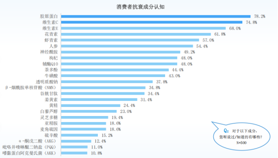随着抗衰市场的持续教育与发展,消费者对口服抗衰成分的认知也日益成熟,其中胶原蛋白成为目前消费者认知度较高的“抗衰成分”。胶原蛋白以78.2%的认知率位居榜首,维生素C(74.8%)、维生素E(68%)紧随其后,成为消费者最熟悉的三大口服抗衰成分;而在不同年龄段消费者关注的抗衰成分TOP5中,胶原蛋白更是稳居前列,成为当之无愧的抗衰“明星成分”,也为口服抗衰产品的研发与市场推广提供了明确的方向。
