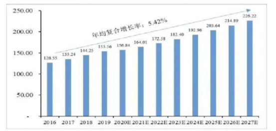 2016-2027年全球胶原蛋白市场规模情况 单位:亿美元