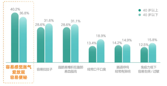 在抗衰老赛道蓬勃发展的同时,全球肠道微生态市场迎来爆发式增长。肠胃健康已成为困扰很多当代人的问题。在春雨医生的调查中,肠胀气、便秘是占比最高的肠道问题。按照人群画像区分,肠道问题较高发生在“久坐的上班族、经常应酬的酒桌族、频繁改变生活环境的出差族、压力过大情绪敏感人群”中,肠道健康问题不容小觑。