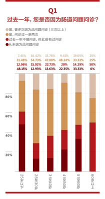 受困于肠道问题,大众对自身肠道健康愈发关注,《肠道健康意识白皮书》显示,有超过80%的调查对象曾因肠胃问题问诊,最近一年因该问题问诊的调查对象则超过60%,其中,更有14.72%的人群过去一年因肠胃问题问诊次数达到3次以上。按照年龄组来看,肠胃健康问题在25至40岁人士中最为集中。在25至30岁以及31至40岁两个年龄段中,均有超过70%的受访者在过去一年因为该问题问诊,多次问诊的人数比例也都超过了15%。