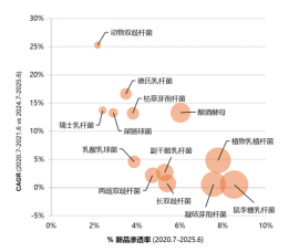 益生菌作为肠道健康产品的常见原料,其品类创新与应用渗透率持续提升——从全球数据看,2023年7月至2025年6月期间,带有肠道/消化健康宣称的食品饮料的新品数量增长42%。