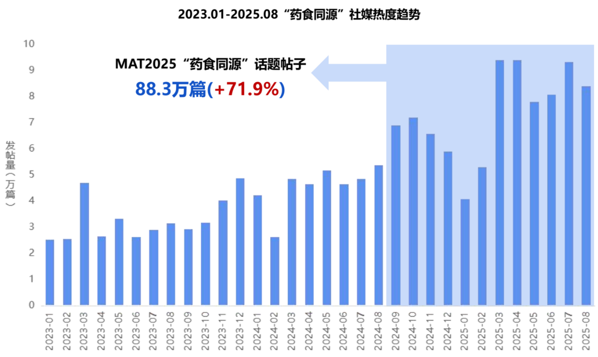 过去,不少消费者会选择中成药作为日常调理的主要方式,如用补中益气丸调理气血、用健脾丸养护脾胃,但随着这类中成药逐步退出市场,消费者开始转向更温和、更安全的药食同源产品。在MAT2025期间,“药食同源”相关社媒话题发帖量达88.3万篇,同比增长71.9%;热门话题主要聚焦年轻群体需求,将养生与日常消费结合。通过将药食同源成分融入茶饮、奶茶等年轻人高频消费的品类,既满足健康养生需求,又适配了现代生活的快节奏与社交属性。