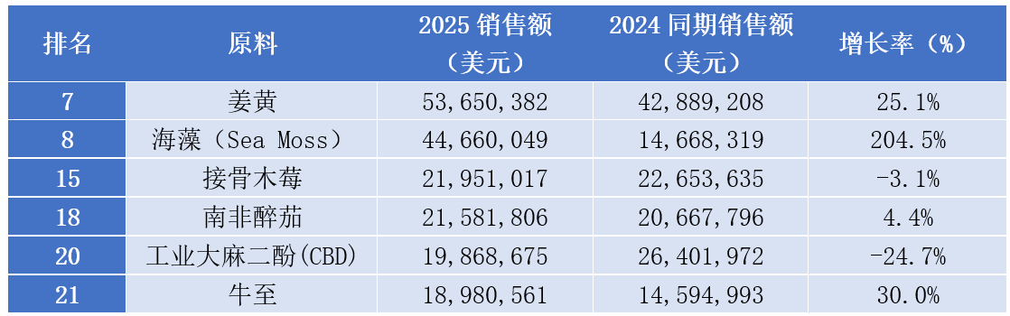 表:2025年美国天然强化渠道-植物原料榜单(Top25)