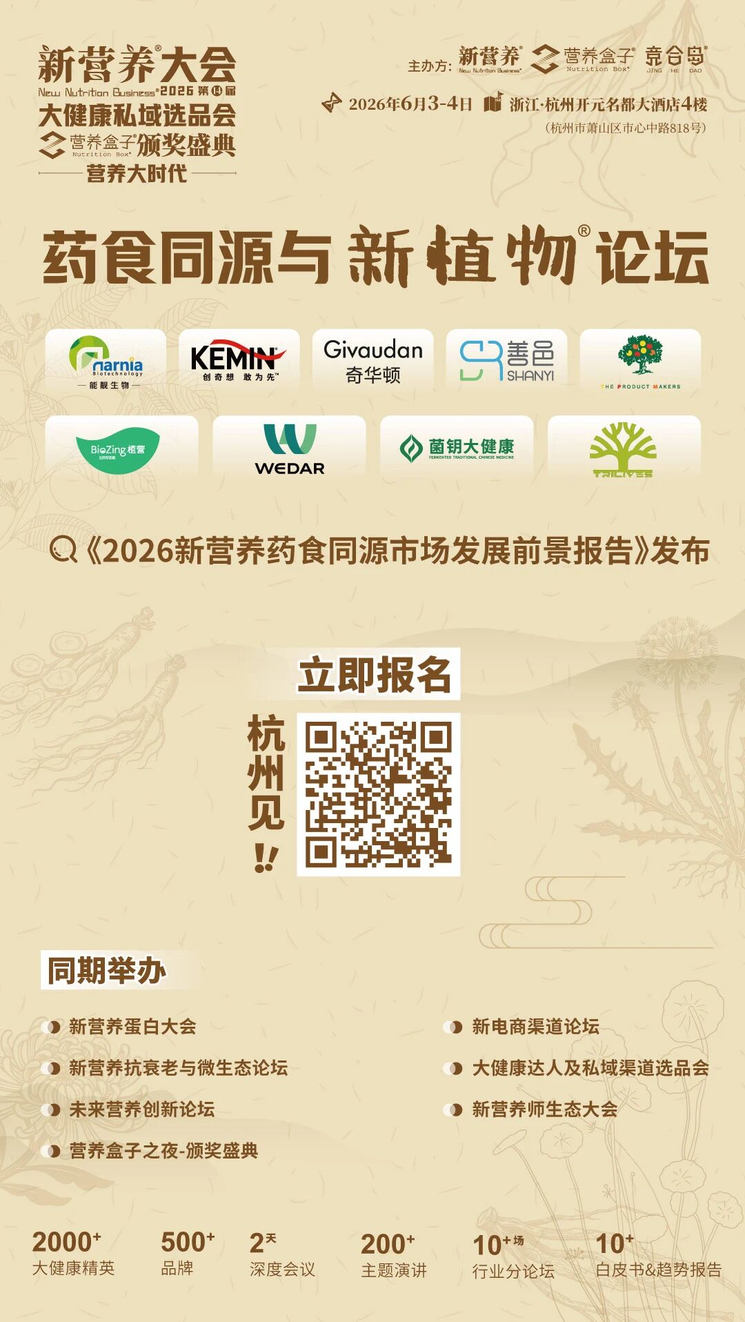 风口已至,未来可期。2026年6月3-4日,新营养大会期间将重磅举办【新营养药食同源与新植物论坛】,作为本次大会的核心分论坛之一,将紧扣“药食同源和天然植物产业的机遇与破局”核心命题,汇聚全球顶尖行业精英、科研先锋、头部企业代表及渠道大咖,打造一场覆盖全产业链的深度交流盛宴。同时,新营养还将发布《2026新营养药食同源市场发展前景报告》,从市场、消费人群、品类创新及渠道布局的实战经验,直击行业痛点与发展趋势。