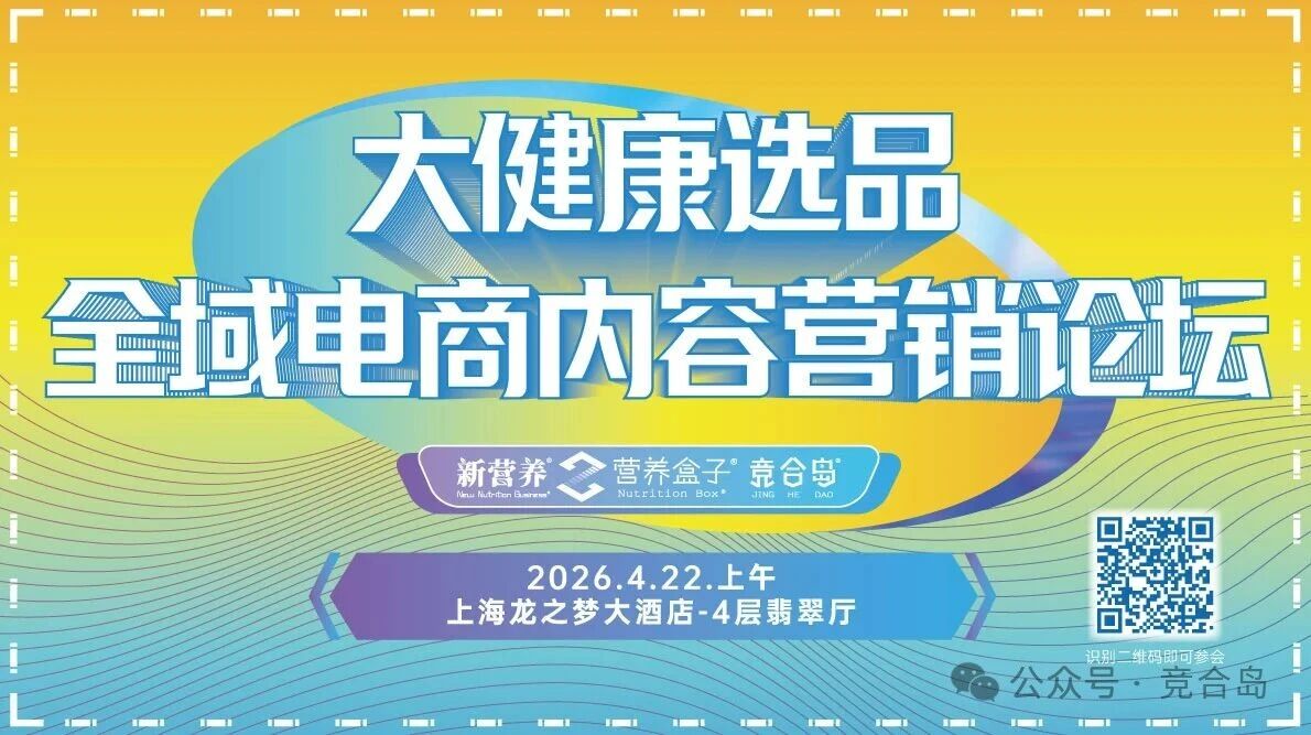 4月22日上午,由新营养、营养盒子、竞合岛将在上海举办「大健康选品全域电商内容营销论坛」,以“好内容・好投放・好增长” 为主题,集结8位行业优质品牌、内容操盘手、全域流量专家、电商运营大咖,共同拆解大健康内容营销的底层逻辑,打通从内容创作到全域分发再到长效增长的全链路,为大健康品牌提供可落地、可复制、可迭代的全域增长方案。