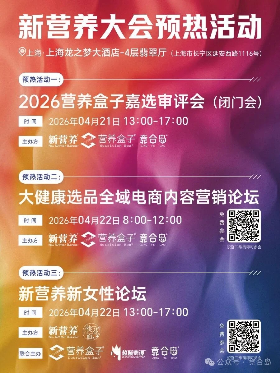 4月22日上午,由新营养、营养盒子、竞合岛将在上海举办「大健康选品全域电商内容营销论坛」,以“好内容・好投放・好增长” 为主题,集结8位行业优质品牌、内容操盘手、全域流量专家、电商运营大咖,共同拆解大健康内容营销的底层逻辑,打通从内容创作到全域分发再到长效增长的全链路,为大健康品牌提供可落地、可复制、可迭代的全域增长方案。