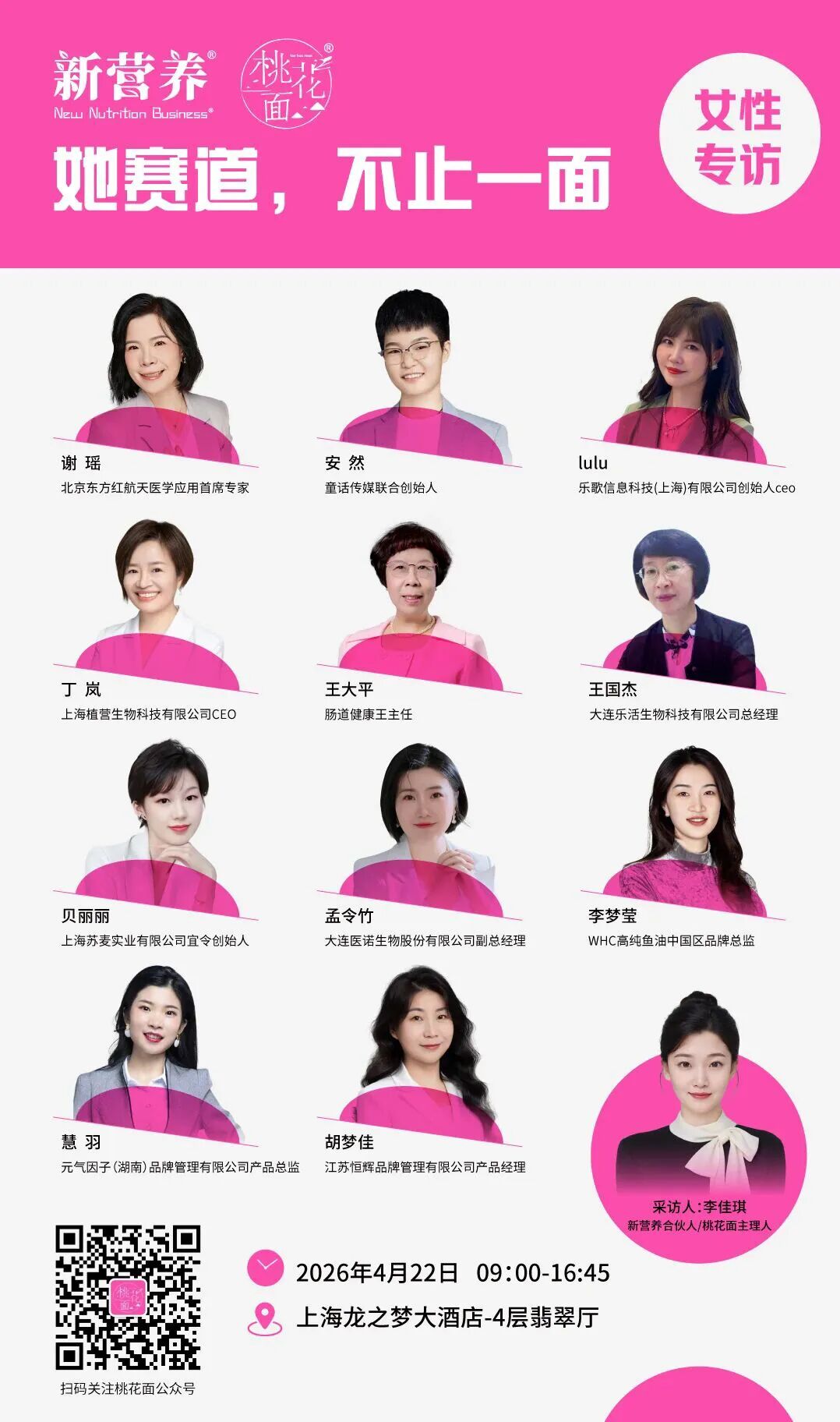 “桃花面”,一个专注于女性创业与发展的内容平台,活动期间将推出“她赛道,不止一面”女性访谈栏目。现场以真实、深入的对话形式,挖掘那些在事业征途上披荆斩棘、温柔而坚定的女性故事。