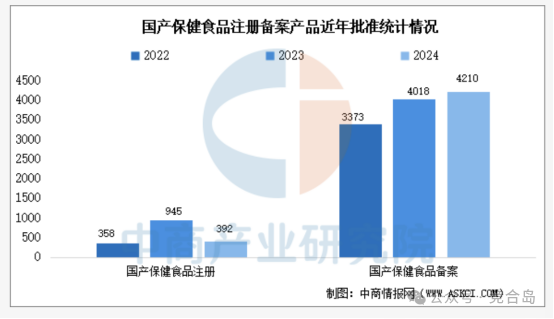 监管双轨制(注册+备案)激活了供给端。2024年共有4210款国产保健食品获得备案凭证,远超注册产品(392款)。其中,补充营养素类产品占比54.8%,显示出基础营养品类的标准化与普及化趋势。