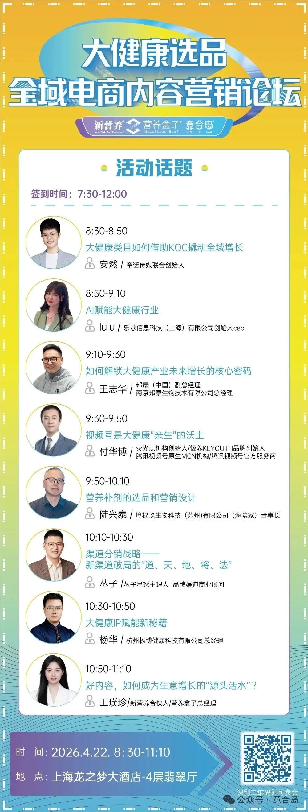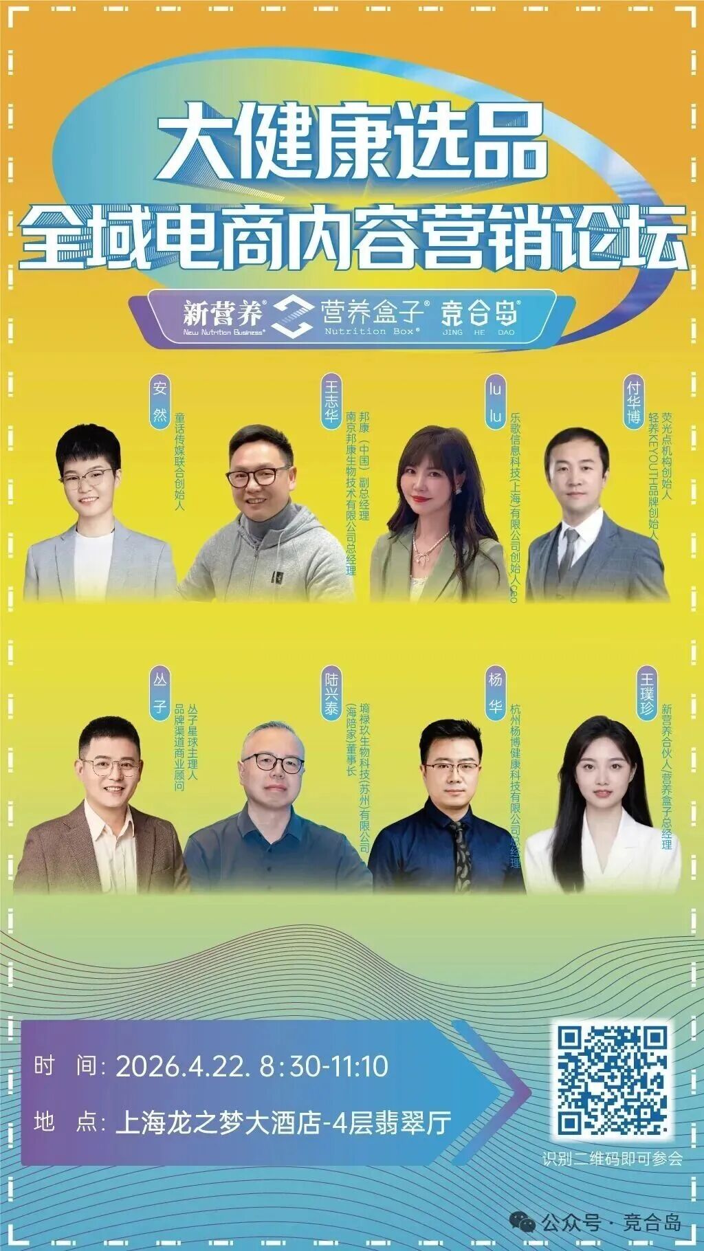 4月22日,由新营养、营养盒子、竞合岛将在上海举办「大健康选品全域电商内容营销论坛」,以“好内容・好投放・好增长” 为主题,集结8位行业优质品牌、内容操盘手、全域流量专家、电商运营大咖,共同拆解大健康内容营销的底层逻辑,打通从内容创作到全域分发再到长效增长的全链路,为大健康品牌提供可落地、可复制、可迭代的全域增长方案。