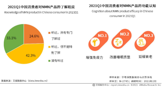 艾媒咨询《2021Q1中国保健品及NMN市场研究报告》显示,2021年超过2/3的中国受访消费者对于NMN产品有所耳闻,其中24.6%的消费者对NMN产品有过深入了解。其中增强免疫力、改善睡眠和抗衰老是消费者对NMN产品最熟知的三大功能。