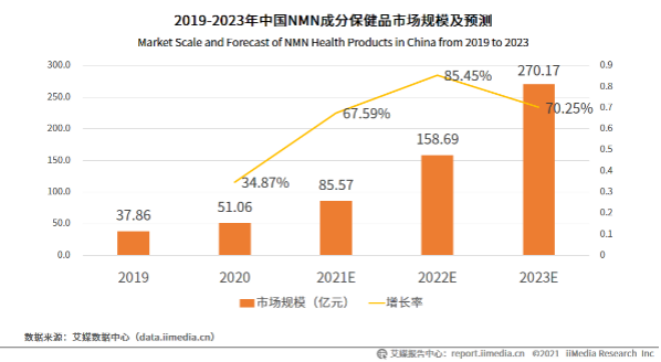 与此同时,品牌也洞察到“NMN抗衰”商机,纷纷在保健食品中添加NMN成分。数据显示2020年中国NMN成分保健食品市场规模达51.06亿元,同比增长34.87%,预计到2023年将攀升至270.13亿元,增速达到70.25%。