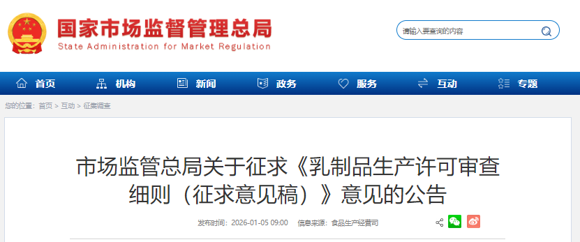 为进一步规范指导乳制品生产许可工作,加强乳制品质量安全监管,市场监管总局组织开展乳制品生产许可审查细则修订工作,形成《乳制品生产许可审查细则(征求意见稿)》,现向社会公开征求意见。欢迎各有关单位和个人提出修改意见,并于2026年2月5日前将《公开征求意见反馈表》反馈至市场监管总局。公众可通过以下途径和方式提出意见: