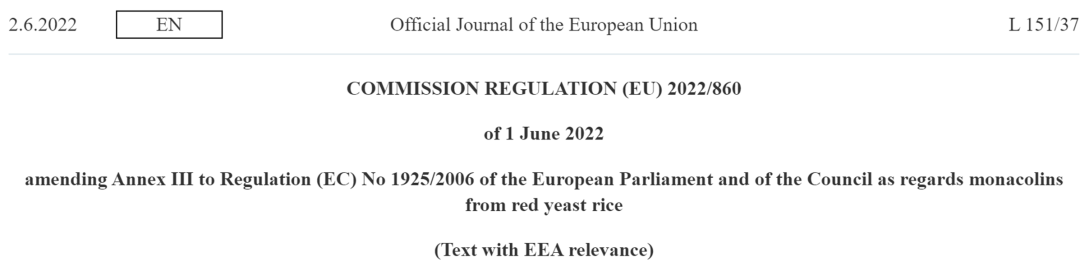 [3] Commission Regulation (EU) 2022/860 of 1June 2022 amending Annex III to Regulation (EC) No 1925/2006 of the European Parliament and of the Council as regards monacolins from red yeast rice (Text with EEA relevance). https://eur-lex.europa.eu/eli/reg/2022/860/oj/eng#ntc3-L_2022151EN.01003701-E0003