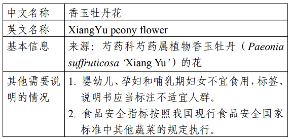 香玉牡丹花是以芍药科芍药属植物香玉牡丹(Paeoniasuf ruticosa ‘Xiang Yu’)的花为原料,经采摘、筛选等工艺制成。目前在河南、山东、山西等地区种植,其花在河南等地区具有食用历史。香玉牡丹花主要营养成分为蛋白质、维生素、矿物质和氨基酸等,且含有少量的多酚类物质。该原料的食品安全指标按照我国现行食品安全国家标准中其他蔬菜的规定执行。