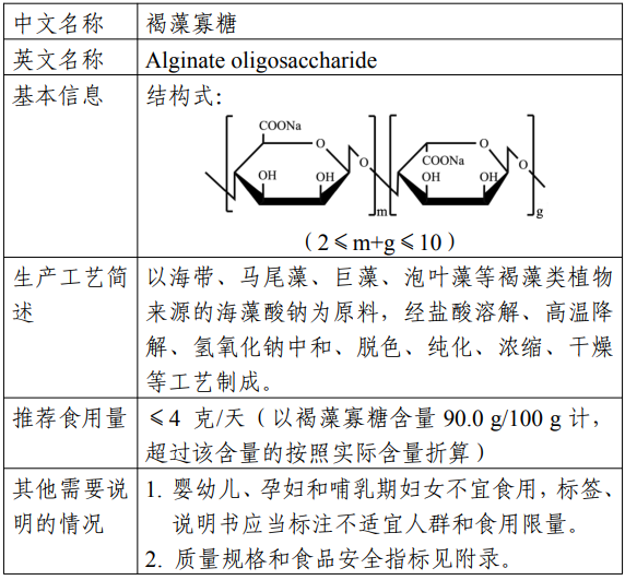 褐藻寡糖是以褐藻(Phaeophyta)来源的海藻酸钠为原料,经过盐酸溶解、高温降解、氢氧化钠中和、脱色、纯化、浓缩、干燥等工艺制成。褐藻寡糖是由β-D-甘露糖醛酸钠和α-L-古罗糖醛酸钠经 1,4-糖苷键交替连接形成的聚合度为2~10 的一种低聚糖。本产品推荐食用量≤4 克/天(以褐藻寡糖含量90g/100g计,超过该含量的按照实际含量折算)。