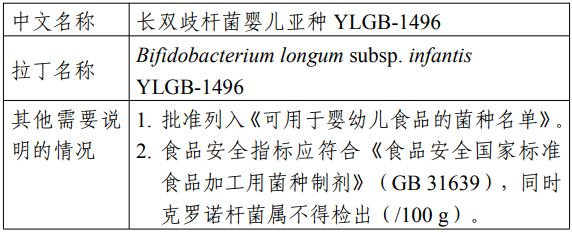 长双歧杆菌婴儿亚种YLGB-1496(Bifidobacterium longum subsp. infantis YLGB-1496)属双歧杆菌属长双歧杆菌婴儿亚种,本产品从母乳中分离获得。本次批准列入《可用于婴幼儿食品的菌种名单》,作为可用于婴幼儿食品的菌种用于食品中直接食用。该原料的食品安全指标按照公告规定执行。长双歧杆菌婴儿亚种已被列入我国《可用于食品的菌种名单》和欧洲食品安全局资格认定(QPS)名单的推荐微生物列表。