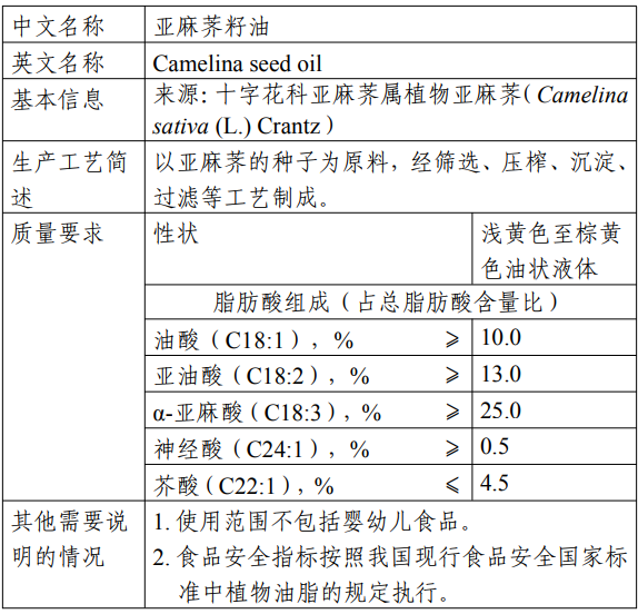 亚麻荠籽油是以十字花科亚麻荠属植物亚麻荠(Camelina sativa(L.) Crantz)的种子为原料,经筛选、压榨、沉淀、过滤等工艺制成。亚麻荠原产于中亚及地中海等地区,在我国东北、西北、华北等地区广泛种植。亚麻荠籽油富含不饱和脂肪酸,主要包括:α-亚麻酸、亚油酸和油酸等,且含有少量的蛋白质、维生素和矿物质。从风险预防原则考虑,本产品使用范围不包括婴幼儿食品。该原料的食品安全指标按照我国现行食品安全国家标准中植物油脂的规定执行。亚麻荠籽油在美国被作为“一般认为安全的物质(GRAS)”管理;加拿大批准其为新食品原料;欧盟允许其作为食品原料。