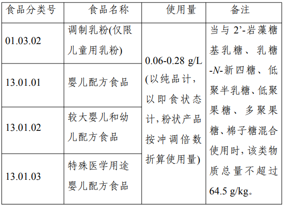 本次公告的3’-唾液酸乳糖钠盐作为食品营养强化剂新品种,用于调制乳粉(仅限儿童用乳粉)(食品类别01.03.02)、婴儿配方食品(食品类别13.01.01)、较大婴儿和幼儿配方食品(食品类别13.01.02)、特殊医学用途婴儿配方食品(食品类别13.01.03)。3’-唾液酸乳糖钠盐是母乳中一种母乳低聚糖,用作食品营养强化剂。经安全性评估,3’-唾液酸乳糖钠盐在所申报食品类别中可以安全使用,其质量规格按照公告的相关要求执行,配套参考检验方法见国家食品安全风险评估中心官网“三新食品”栏目。美国食品药品管理局、欧盟委员会、澳大利亚和新西兰食品标准局等允许3’-唾液酸乳糖钠盐用于婴幼儿配方食品等食品类别。