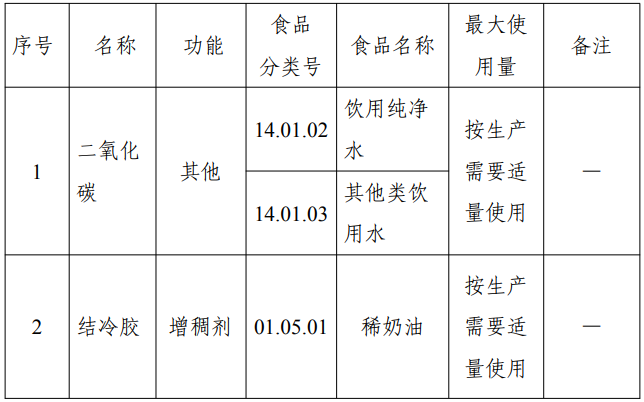 二氧化碳作为食品添加剂已列入《食品安全国家标准 食品添加剂使用标准》(GB 2760),允许用于风味发酵乳、饮料类、配制酒等食品类别,本次公告扩大使用范围用于饮用纯净水(食品类别14.01.02)和其他类饮用水(食品类别14.01.03),调节产品口感。经安全性评估,二氧化碳在饮用纯净水和其他类饮用水中可以安全使用,其质量规格执行《食品安全国家标准 食品添加剂二氧化碳》(GB 1886.228)。根据联合国粮农组织/世界卫生组织食品添加剂联合专家委员会评估结果,对二氧化碳的每日允许摄入量“不作具体规定”,国际食品法典委员会、美国食品药品管理局、欧盟委员会等允许其用于包装饮用水。