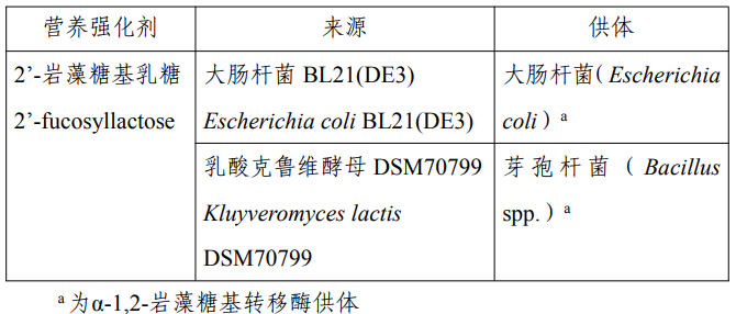 该物质的质量规格要求按照国家卫生健康委员会2023年第 8 号公告执行(附录 C 用于生产2’-岩藻糖基乳糖的生产菌信息除外),该营养强化剂新品种的生产菌信息见下表。