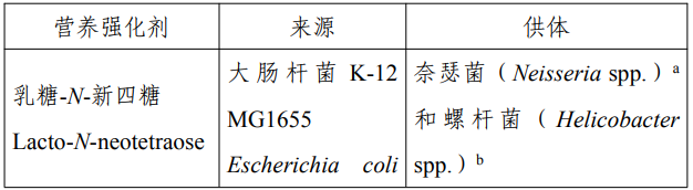 该物质的质量规格要求按照国家卫生健康委员会2023年第 8 号公告执行(附录 D 用于生产乳糖-N-新四糖的生产菌信息除外),该营养强化剂新品种的生产菌信息见下表。